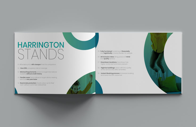Vi designade en informativ och visuellt tilltalande broschyr för Harrington Housing, som effektivtpresenterarderas studentboenden i Kanada för att attrahera och informera potentiellahyresgäster.